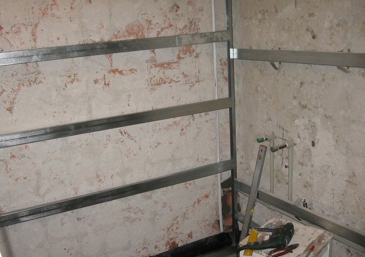 - Сразу стоит заметить, что она буквально повторяет возведение каркаса для гипсокартона. Все начинается с установки П-образного профиля. Его проверяют при помощи уровня. Для крепежа используют дюбель и саморезы.