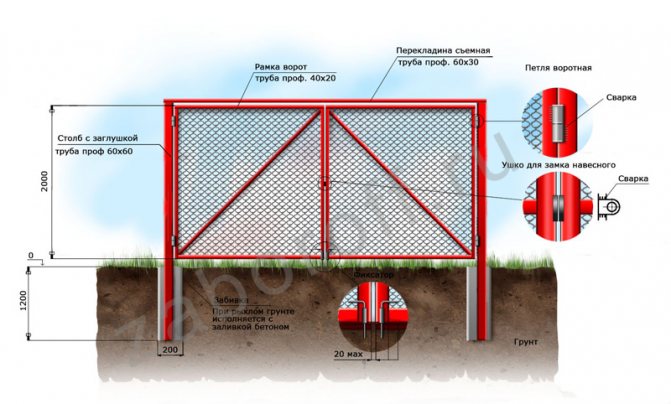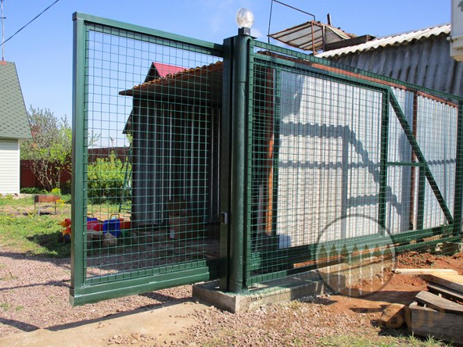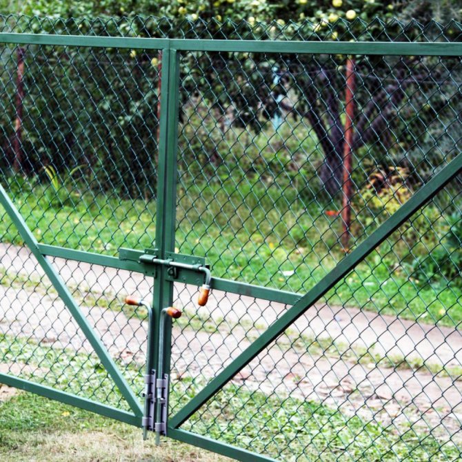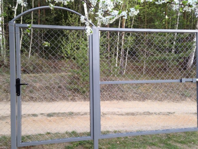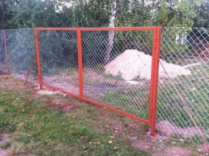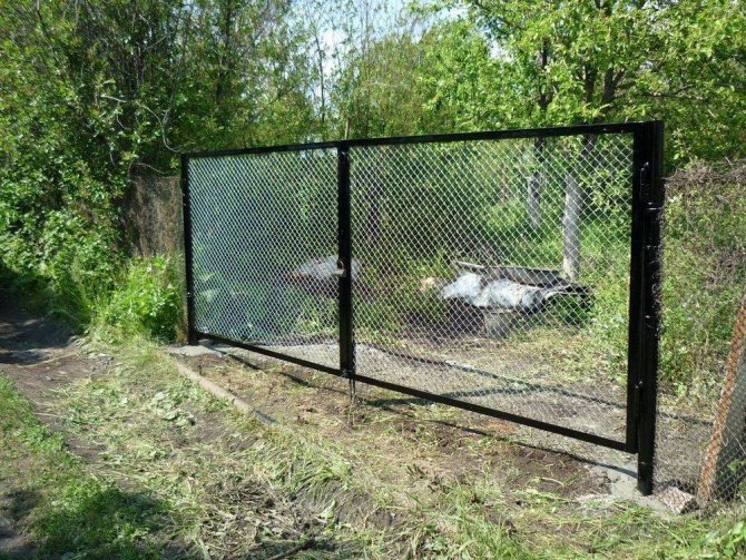Натяжной вид конструкции из рабицы не очень затратный. Как правило, такой вид ворот используют чаще всего.