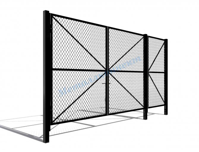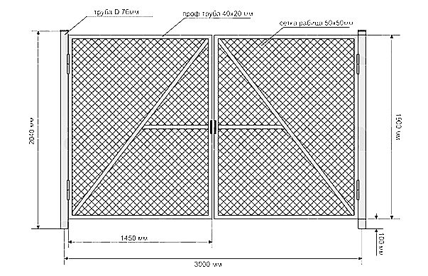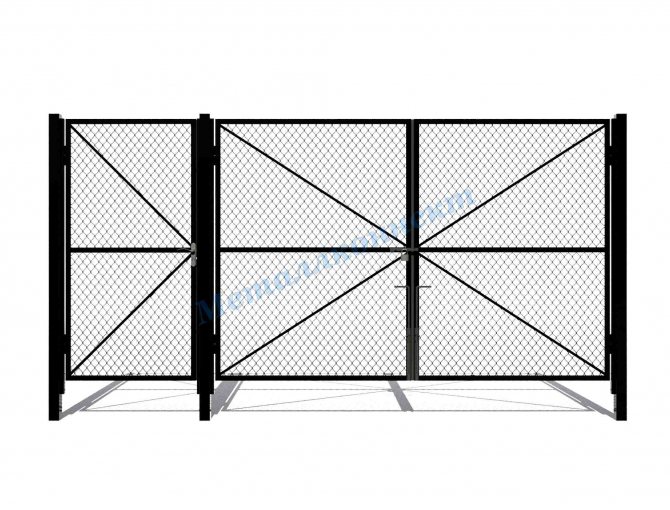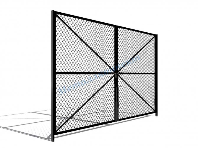 Традиционная конструкция ворот, которые можно сделать из сетки-рабицы, — это простые распашные створки. Общая ширина проема при этом может составлять от 3 м. Это позволяет обеспечить проход легкового и грузового транспорта.