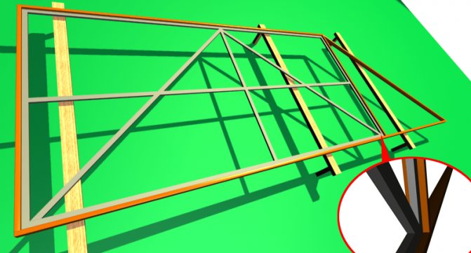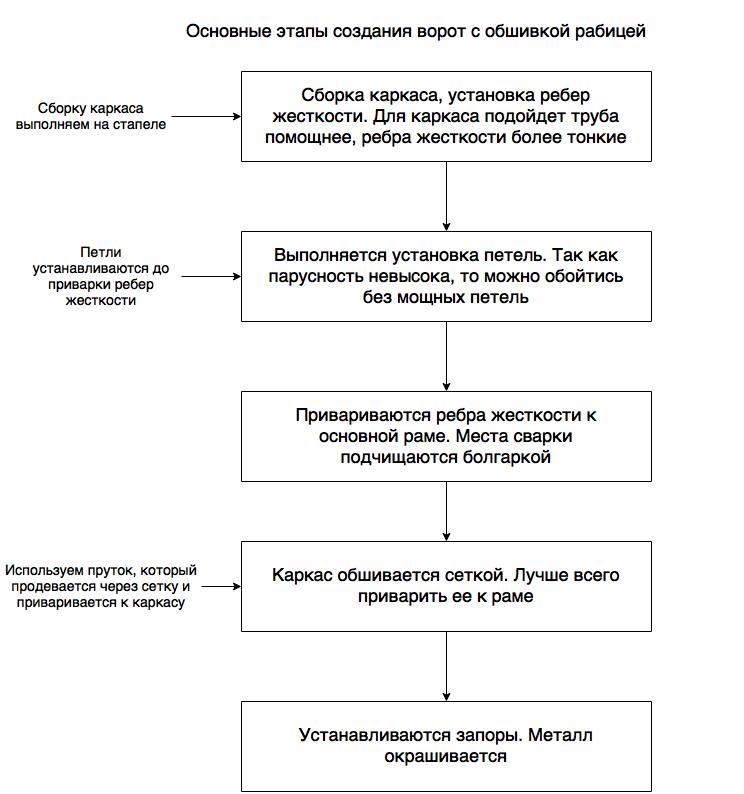 Сборка ворот происходит подобным образом, вся разница лишь заключается в размере конструкции. Как правило, ворота делают 3-3,6 метра шириной. Для придания конструкции жесткости можно приварить дополнительные вертикальные поперечины с шагом 0,5–1м, укрепленные ворота прослужат гораздо дольше.