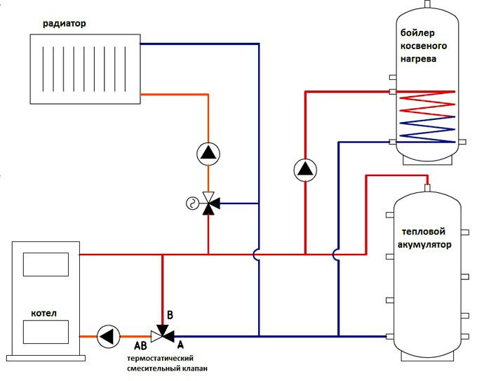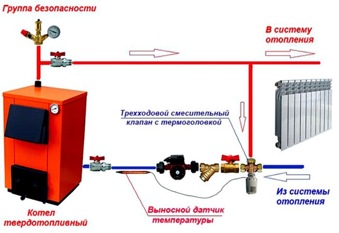 Допускать попадания холодной воды в камеру сгорания котла нельзя! В таких схемах обязательно используют клапаны с приводом.