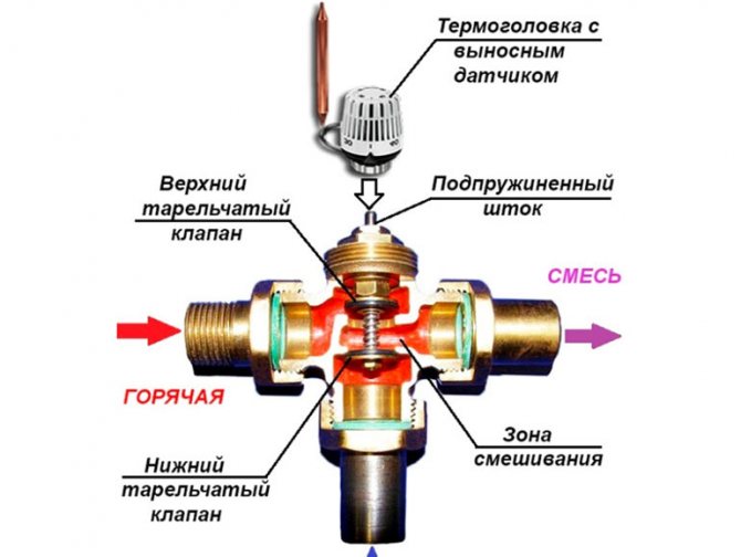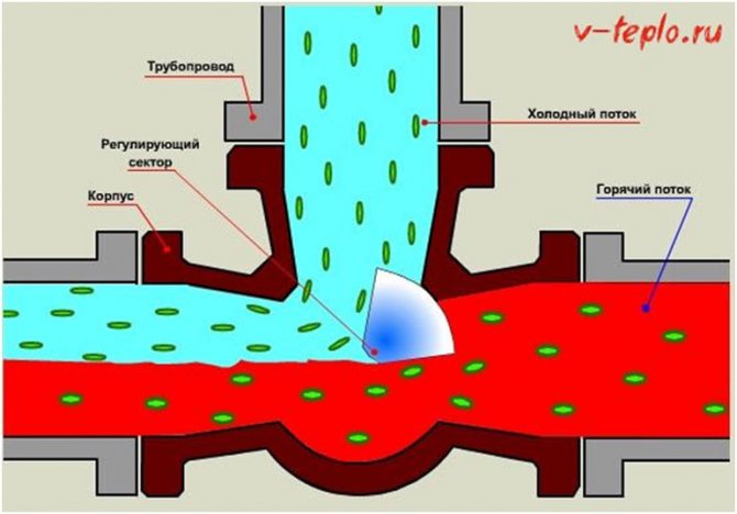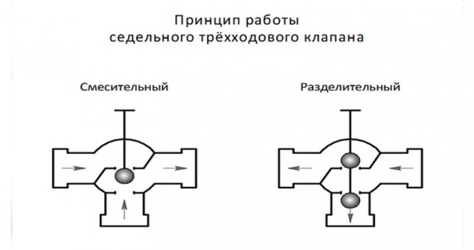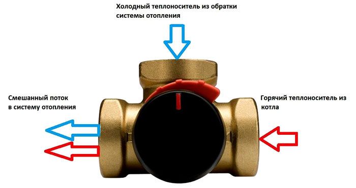 У смешивающих клапанов шток состоит из двух плоских дисков круглого сечения или одной сферы со сквозным отверстием. Запорный элемент разделяет устройство на два патрубка, соответствующих контурам отопления. Регулирование происходит за счет движения штока, который может подниматься/опускаться либо делать неполный оборот вокруг своей оси, перекрывая один и открывая другой патрубок.