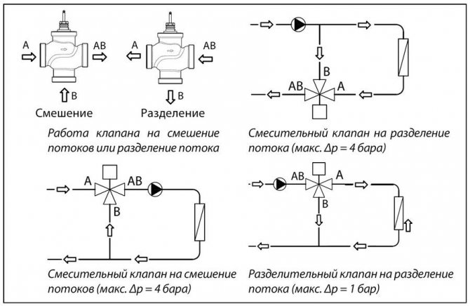 Теперь перейдем к рассмотрению другого вида клапанов — переключателей направления потока. Собственно, такие клапаны могут работать и как смесительные, но управляются они при помощи ручной настройки или сервопривода. Для большей наглядности смотрите рисунок ниже: