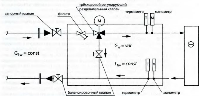 Обратите внимание! Эта схема подключения обрела широкую популярность в узлах водо- и воздухонагрева, которые подключены от индивидуальных котелен.