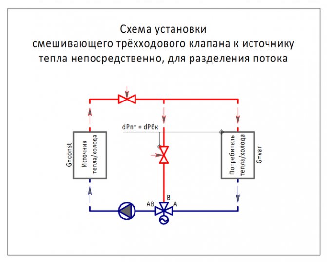 Обратите внимание! Если трехходовой клапан будет подключаться напрямую к источнику тепловой энергии на байпасе, подсоединенному к порту В, то потребуется и монтаж клапана с гидросопротивлением, равным аналогичному сопротивлению этого источника.
