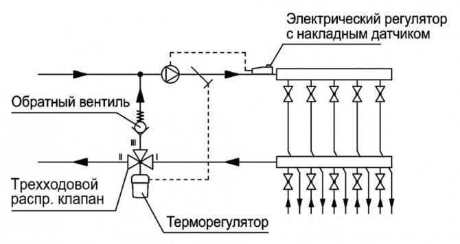 В случае если перегревание обрата допускается, от чрезмерного напора избавляются посредством перемычки, установленной параллельно к подмесу клапана в контуре.