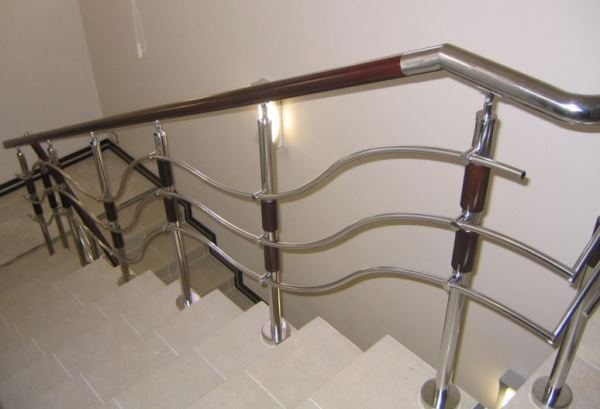 Также встречаются комбинированные варианты. Например, сочетание стекла со стальными стойками и поручнями.