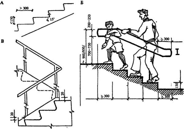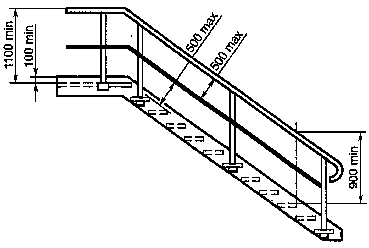 - конец поручня должен быть закруглен и выступать за линию ступени на тридцать сантиметров;