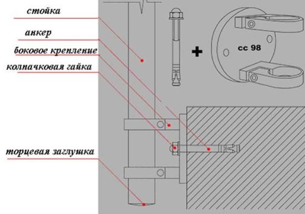 - Крепление на двух распорных анкерах через втулку. Такой способ актуален в тех случаях, когда необходимо столб установить около ступени.