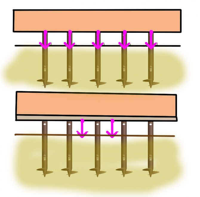 Способом распределить нагрузочные напряжения более равномерно служит обвязка свайного фундамента. Она одновременно служит скрепляющим все опоры конструкционным элементом, а также – единым основанием для установки домовой конструкции.