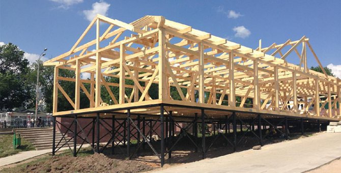 - Соединение свай. Чтобы соединить опоры, делают ростверк. Под баню подойдет брус либо бревно. Древесину кладут на оголовки, выполняя в ней вырезы под них. Затем скрепляют брусья по углам. К оголовкам раму крепят болтами. Далее возводят стены, закрывают их крышей.