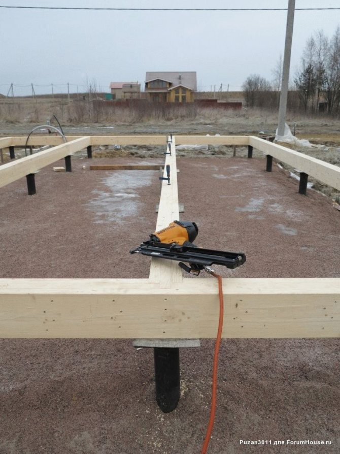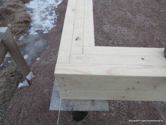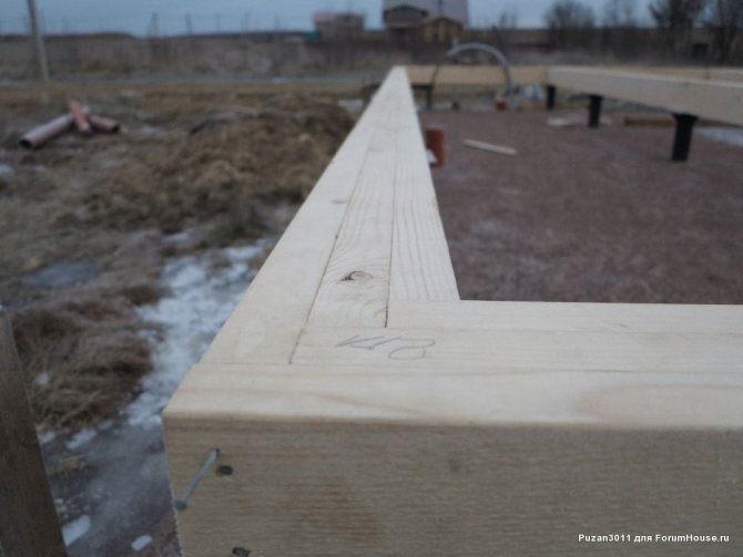 - Выполняем сборку нижней обвязки, начиная с периметра. Пиломатериал необходимо запилить согласно плану обвязки. Торцы соединяются при помощи гвоздей.