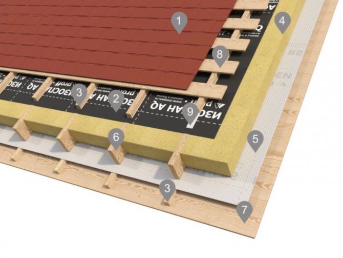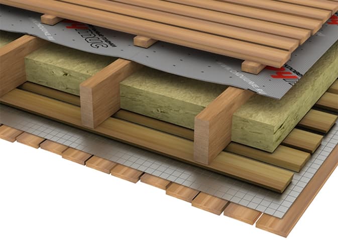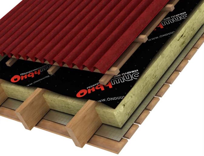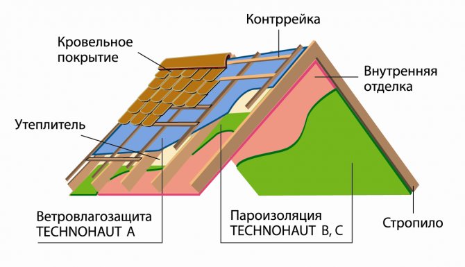 В конструкции утеплённой скатной кровли для защиты утеплителя и несущих элементов от подкровельного конденсата, ветра и атмосферных осадков, проникающих под кровельное покрытие, рекомендуется применять трёхслойные гидро-ветрозащитные мембраны.