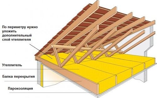 - утеплитель, проложенный между стропильными ногами до места излома и горизонтально по опорным балкам;