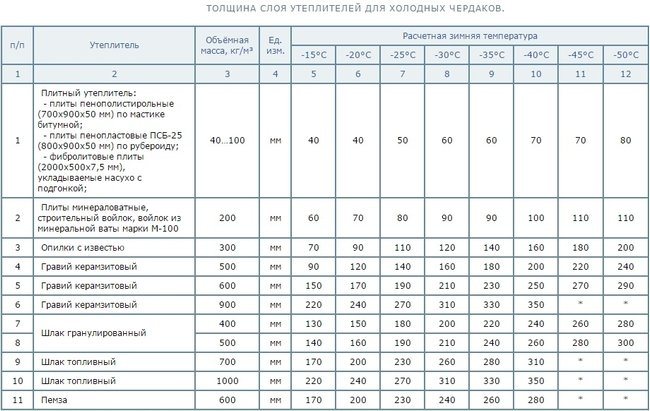 Толщину необходимого слоя утеплителя выбирают в зависимости от расчетной зимней температуры при помощи таблицы ниже.