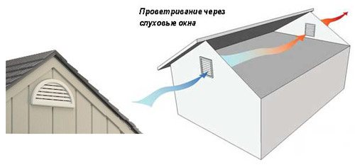 Вентиляция обеспечивается за счет карнизных и коньковых продухов. Воздух, проходящий через карнизные отверстия называется приточным, а выходящий через конек – вытяжной. Дополнительно можно сделать вентилирование через слуховые окна на фронтонах или скатах крыши. Окна оборудуют жалюзийными решетками для возможности регулировки интенсивности проветривания.