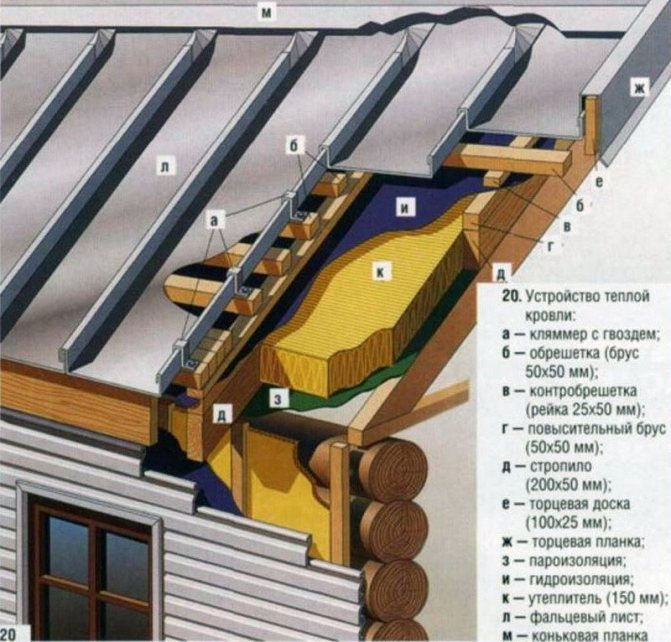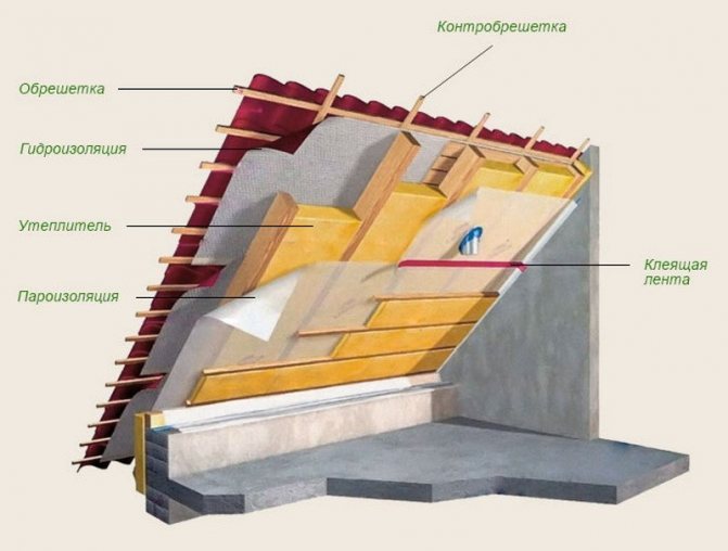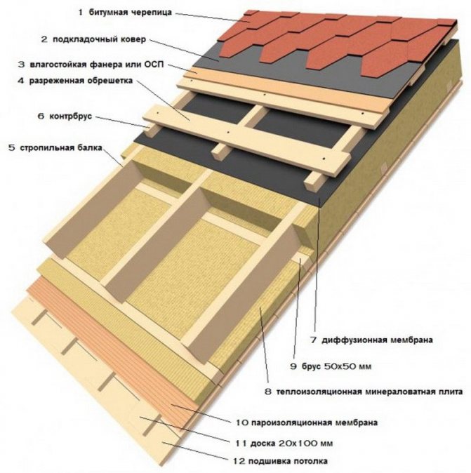 Для покатой холодной крыши кровельный пирог разбивается на две части, расположенные в разных зонах.
