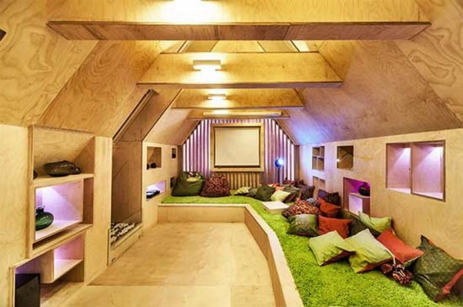 Облицовка подкровельного помещения влагостойкими плитами МДФ с использованием игры света позволяет сделать необычные яркие акценты на отдельных элементах интерьера