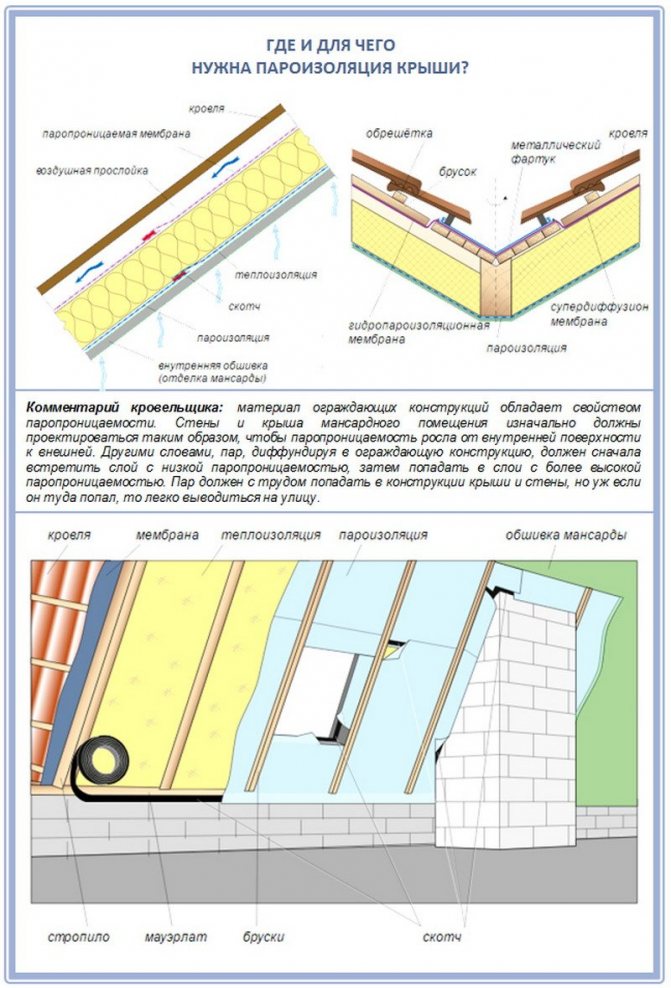 При обустройстве утеплённой кровли нужно уделить особое внимание герметичности стыков всех кровельных слоёв в труднодоступных для монтажа и поэтому особо проблемных местах — стенах, вентиляционных стояках и дымоходных трубах, окладах мансардных окон и ендовах. Нарушение герметичности чревато возникновением мостиков холода и потерями тепла через кровлю.
