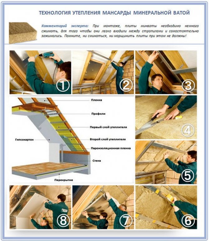 - минераловатные плиты, проложенные между стропил с таким расчётом, чтобы утеплитель не доходил до верхней кромки на 50–70 мм;