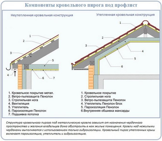 Количество слоёв кровельного пирога под металлочерепицу зависит от структуры кровли — утеплённая или холодная.