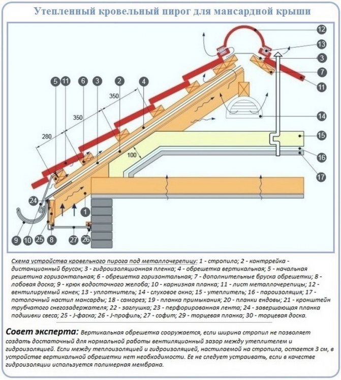 В кровельном пироге под металлочерепичную тёплую кровлю должны присутствовать все стандартные материалы и вентиляционные зазоры