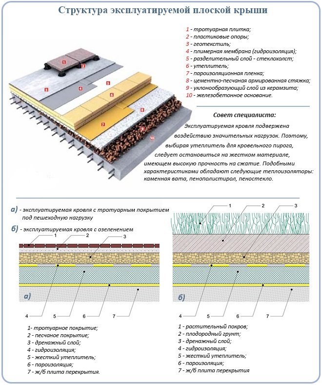 Состав кровельного пирога для эксплуатируемых кровель зависит от их предназначения