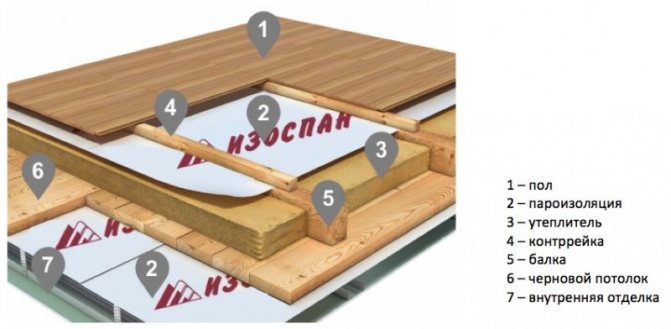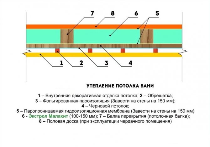 . Как для деревянных, так и железобетонных перекрытий обязательным является пароизоляция. Она укладывается на само перекрытие и обеспечивает защиту утеплителя от паров, которые могут сконденсироваться в теплоизоляторе, пройдя через потолок жилого помещения. В качестве утеплителя могут применяться плитные и насыпные материалы. Пирог потолка состоит из пароизоляции, балок перекрытия и утеплителя.