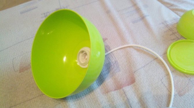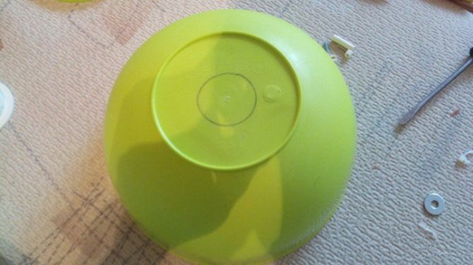 В маленькой миске делаем небольшое отверстие, чтобы провод туго проходил. Оригинальный плафон готов!