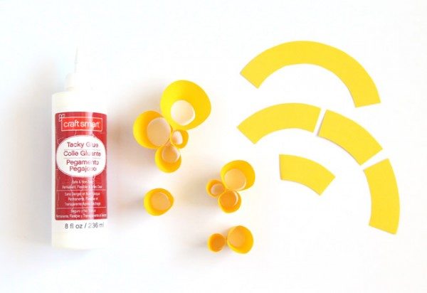 С помощью циркуля на бумаге рисуем полукруги шириной не более 2 см. Вырезаем их и разрезаем на кусочки, как показано на фото.