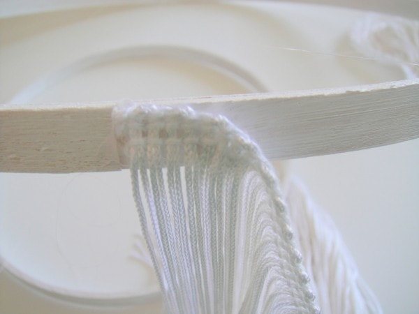 Приклеиваем тесьму с бахромой к большому кругу. Особенно аккуратно делаем это в местах, где привязана леска.