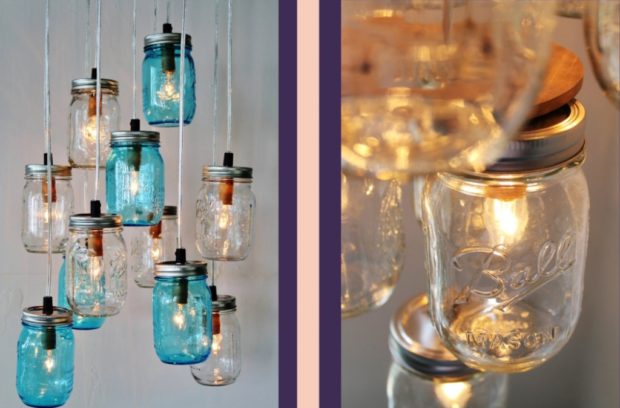 Нам подойдут и стеклянные банки, особенно если они имеют нестандартную форму и цвет. Впрочем, цвет вы можете придать им любой, это очень просто. Заранее приготовьте патроны и лампочки. Чтобы поместить их вовнутрь аккуратно проделайте в крышках отверстия с помощью ножа для открывания. В будущем у вас возникнет необходимость замены лампы, поэтому отдайте предпочтение закручивающимся банкам. Отверстие должно равняться диаметру патрона, не более того. Проденьте часть с резьбой в отверстие в крышке, а потом закрутите лампочку. Теперь приступим к оформлению самих плафонов. Тщательно вымойте и высушите банки. Теперь можете их красить, разрисовывать, оклеивать бисером или цветами, обматывать цветными нитками или кружевом, в общем, все, что вам угодно. Закрепите окрашенную или оклеенную мелкими деталями поверхность прозрачным лаком и закрутите крышки. Ваши плафоны готовы.