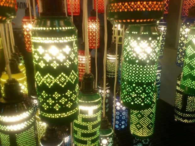 Для того, чтобы сделать стильный и необычный абажур, который отлично дополнит интерьер своим мягким, уютным светом, можно использовать обычные жестяные банки разных размеров. Необходимо снять все этикетки, убрать остатки клея с поверхности, вымыть и хорошо просушить. Далее мы будем с помощью небольшого молотка и гвоздя делать отверстия на стенках. Нарисуйте маркером желаемый узор, налейте в банку воды и поставьте в морозилку до полного замерзания. Это делается для того, чтобы в момент проделывания отверстий, банка не деформировалась. Второй вариант сохранить форму – плотно набить ее бумагой. Осталось аккуратно проделать отверстия и окунуть готовое изделие в горячую воду для удаления льда. У вас получатся небольшие милые плафоны, из которых рекомендовано создавать композиции. Поверхность можно оставить без изменений, а можно покрасить или обернуть тонкой бумагой.