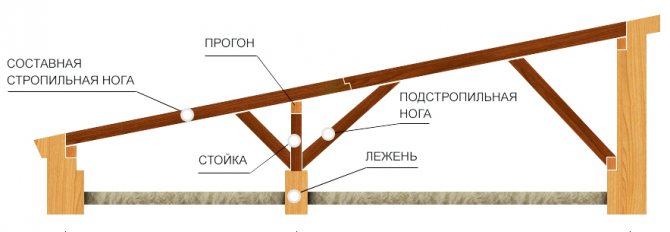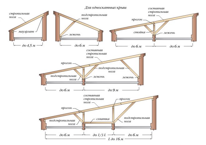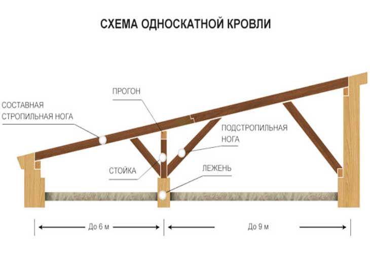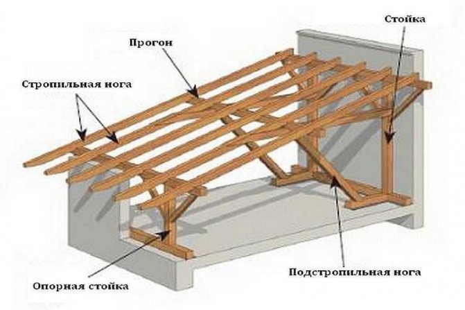 В составе конструкции есть одна плоскость ската, которая формируется самостоятельной системой стропил. Крайние части стропильных ног сооружаются на надёжных опорах, поэтому их относят к категории наслонных. Система стропил состоит из отдельных элементов, которые опираются концами на противоположные стенки постройки.