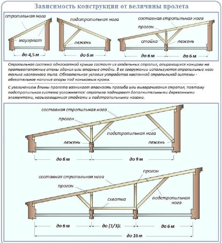 Приведенные примеры могут использоваться в качестве основы для индивидуальных конструкций, поэтому устройство односкатной стропильной системы необходимо знать подробно.
