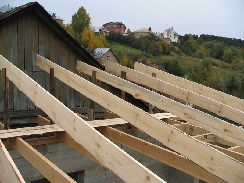 - для пролета шириной до 4,5 м подойдут стропила из бруса 15 х 5 см, до 6 м – из досок 200 х 50 мм, сращиваемых попарно или в длину;