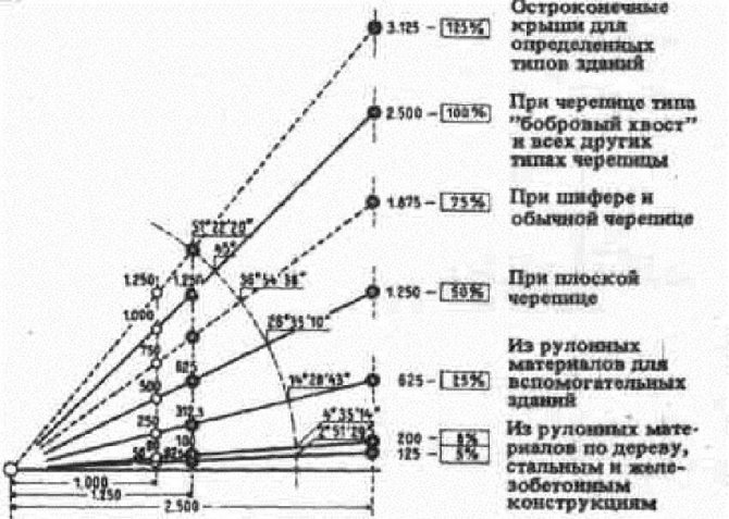В зависимости от вида кровельного покрытия, допускается разные углы наклона ската крыши. Ниже, приведены значения для наиболее популярных стройматериалов