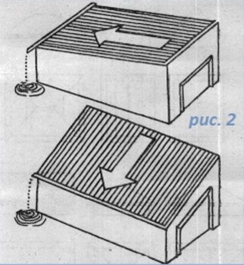 Водосточную систему в таких домах делают наружной, устраивать внутреннюю нет надобности. Сливные желоба следует устанавливать со стороны низкой стенки «в крест» по направлению к стоку.
