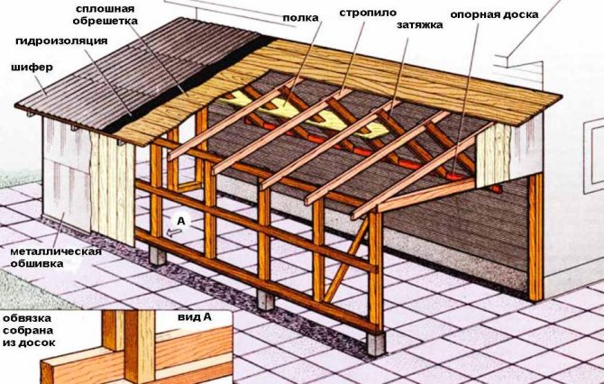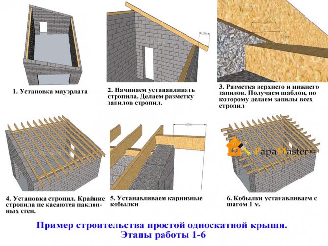 Алгоритм устройства стропильной системы для односкатной крыши над сараем предполагает выполнение следующих действий:
