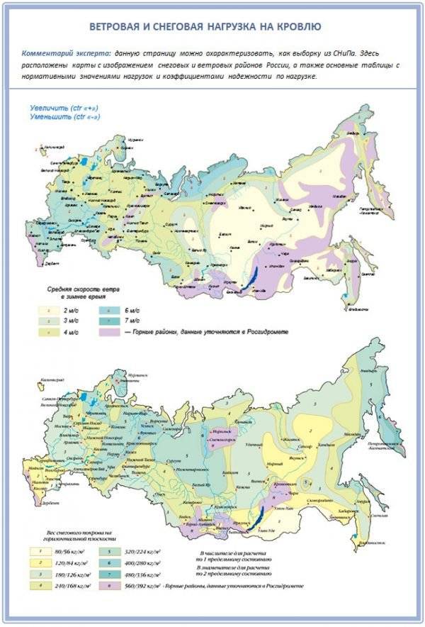 Очевидно, что тщательный расчёт нагрузок от снега и ветра с учётом местных климатических условий жизненно необходим при выборе конструкции и материалов кровли. Эти нагрузки можно определить по карте, составленной на основании СНиП 2.01.07–85.