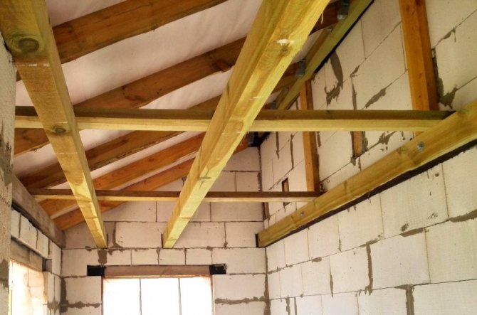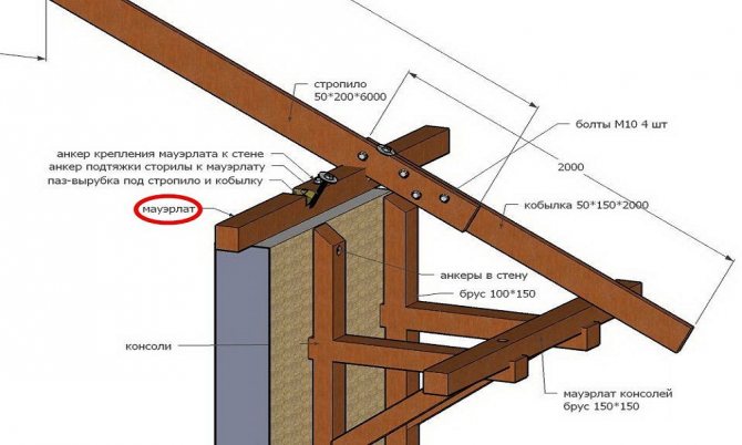 Детали следует монтировать по отдельности. Они устанавливаются на разные по высоте стены, с которыми скрепляются через мауэрлат. Последний отличается от обыкновенной деревянной рамы. Конструкция состоит из двух брусьев, которые укладываются параллельно на стенки из камней, последний венец сруба или на обвязку каркасного строения.