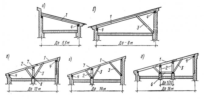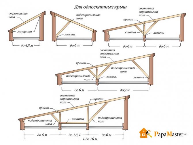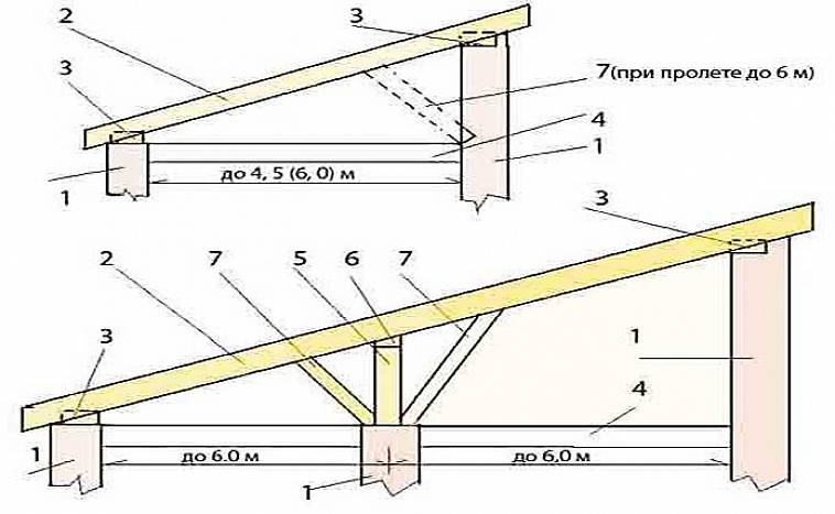 Стропильная система односкатной крыши обычно имеет несколько вертикальных опор