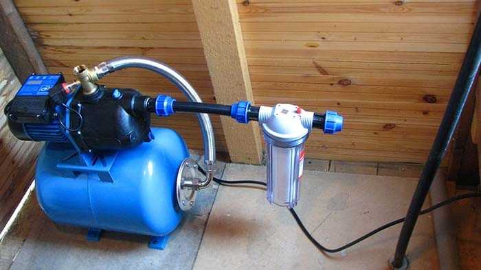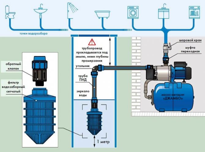 - Насос погружного или поверхностного типа. Качает воду из колодца или скважины, поддерживает стабильное давление в системе. С домом соединен при помощи труб.