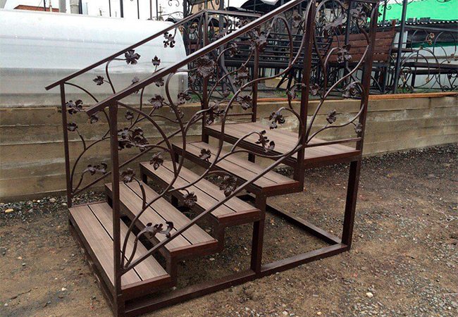 Таким образом получим кованное крыльцо. А для деревянных брусьев прибиваем опору. При этом на тетиве делаем вырезки в половину доски и вставляем в них ступени.