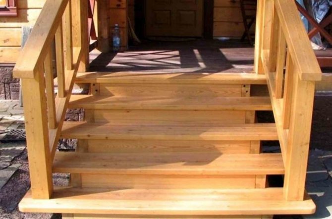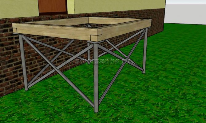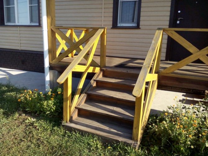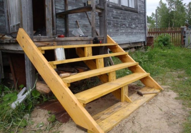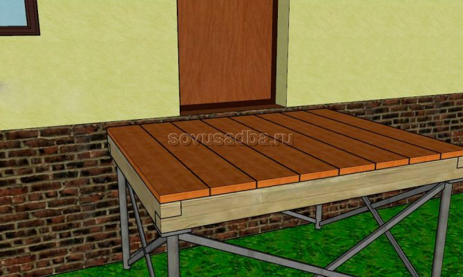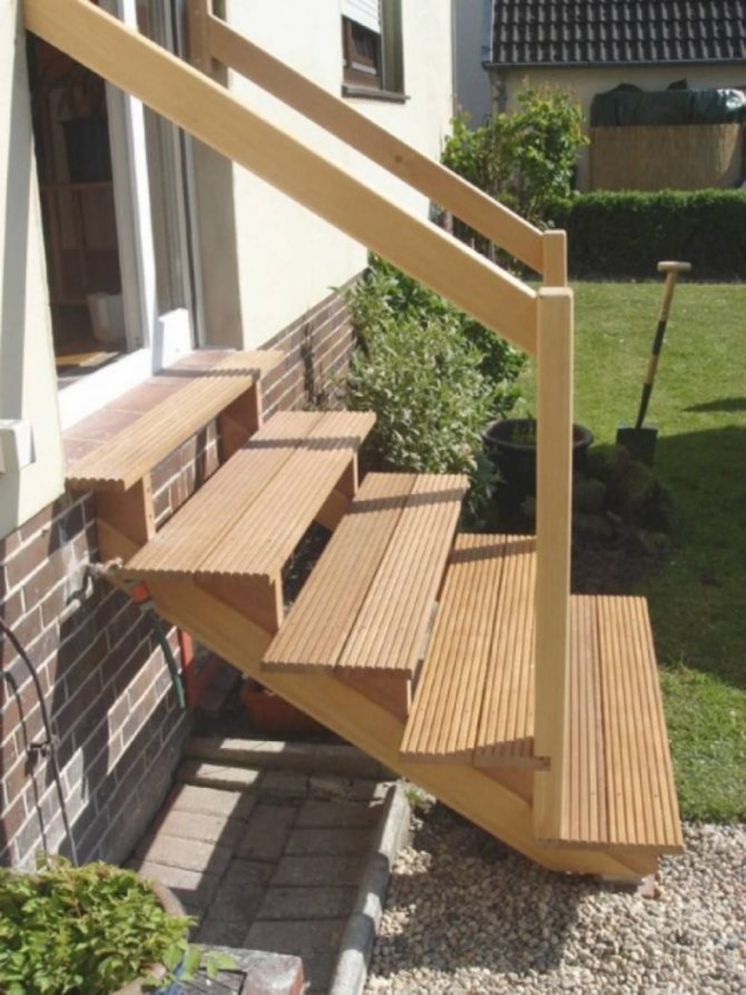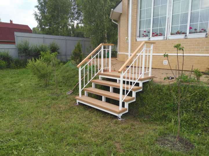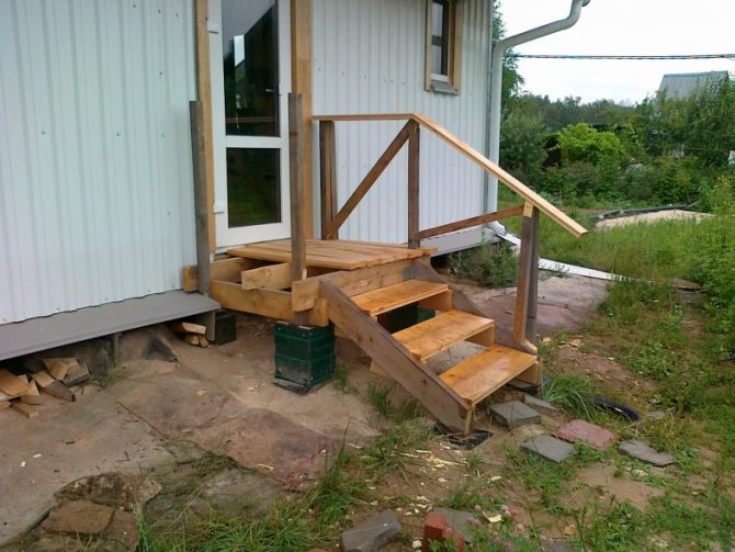 Это упрощенный вариант крыльца, в особенности для небольшого дачного домика. К тетивам крепят опору из брусков. Для металлических брусьев оставляем несколько градусов наклона, а потом привариваем.