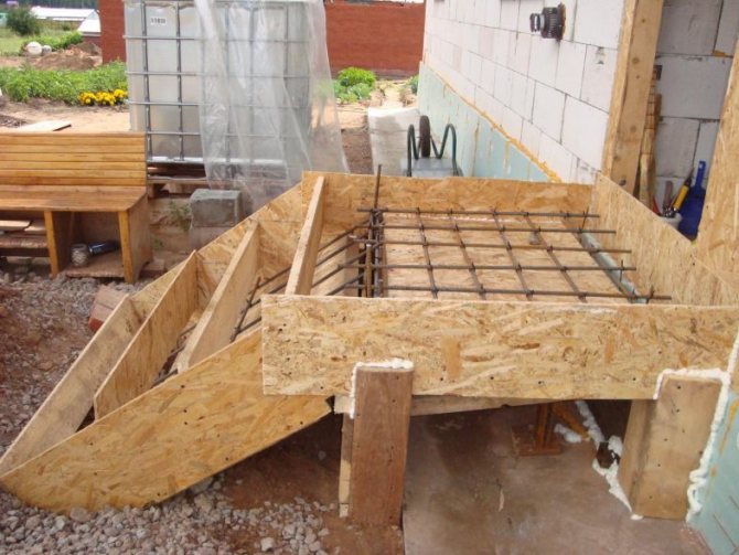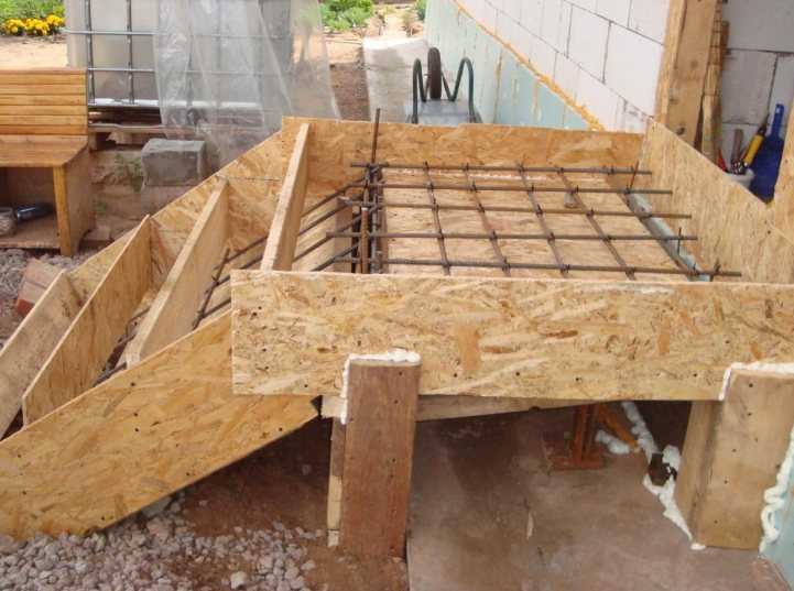 Опалубку ступеней делают выше планируемой поверхности на 5 см, а площадки — на 10 см для удобства выравнивания раствора.
