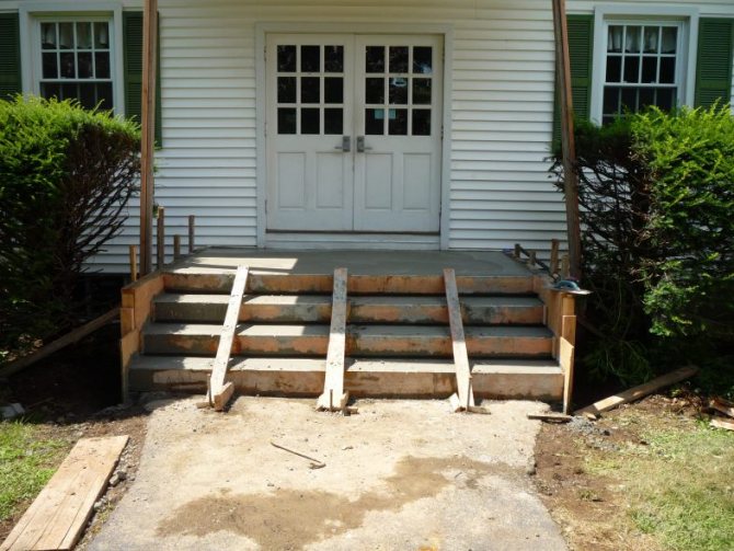 - Приступаем к заполнению опалубки бетоном. Нужно готовить большое количество смеси в короткий срок, поэтому, если размеры крыльца достаточно велики, без электрической бетономешалки не обойтись. Также следите за консистенцией используемого раствора. Из слишком жидкого бетона вы не сформируете ступени правильной формы.