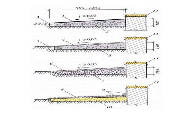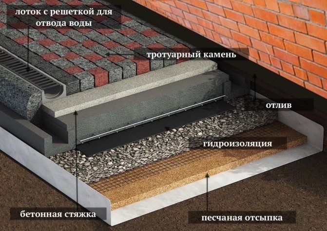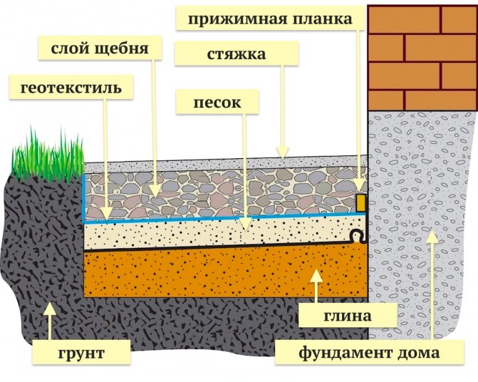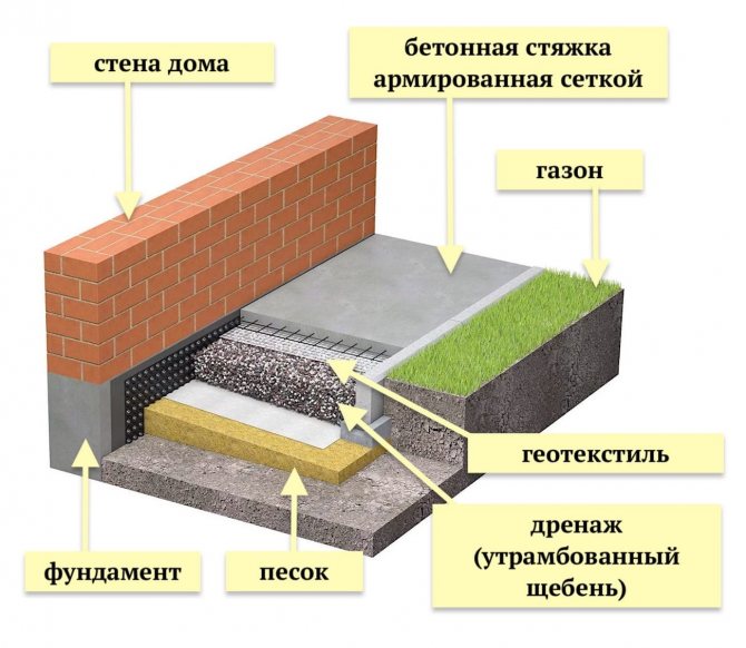 Бетон – это лишь «вершина айсберга». Также как полы, кровли, каркасные стены и перекрытия, отмостка из бетона – это многослойный «пирог», включающий: