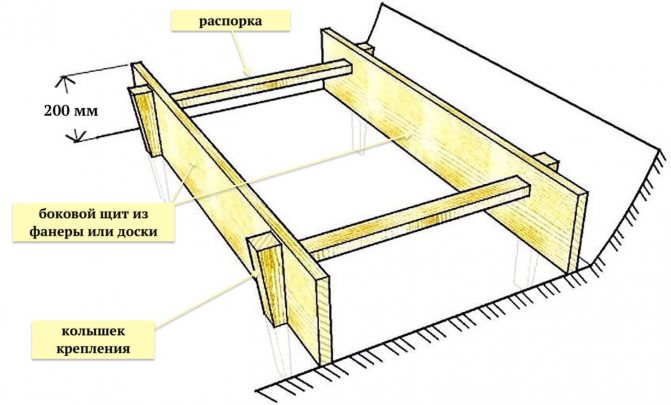 - Установить между шнуром и колышками бортики опалубки – их можно прикрутить саморезами или прибить гвоздями. Горизонтальное положение бортиков и постоянство уклона контролируют при помощи строительного уровня.