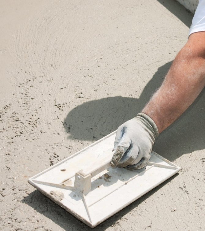 - сухое. Обработку производят сразу после заливки, пока бетон еще сохранил естественную влажность и пористость. Поверх отмостки насыпают ровный слой цемента толщиной 2 мм и тщательно его затирают. Цемент быстро «въедается» – по бетону можно ходить (но не эксплуатировать на 100%) уже через 2 часа;
